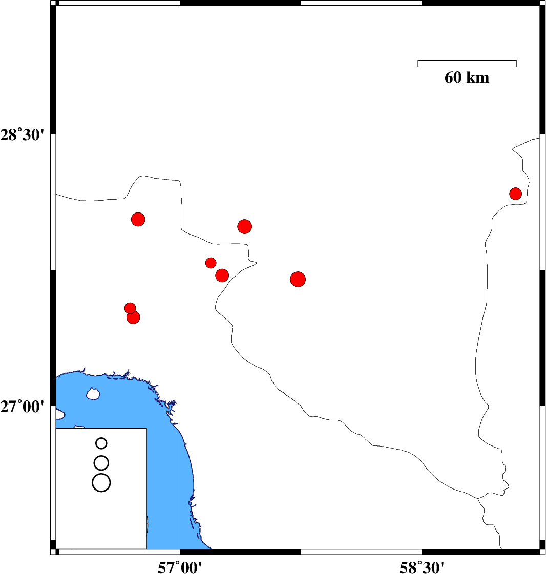 2014/08/31 | 12:14:46.3 | 16:44:46.3 | 27.99 | 57.4 | 18 | ML:3.9 | Kerman Province, 29 km West of Kahnuj | ||