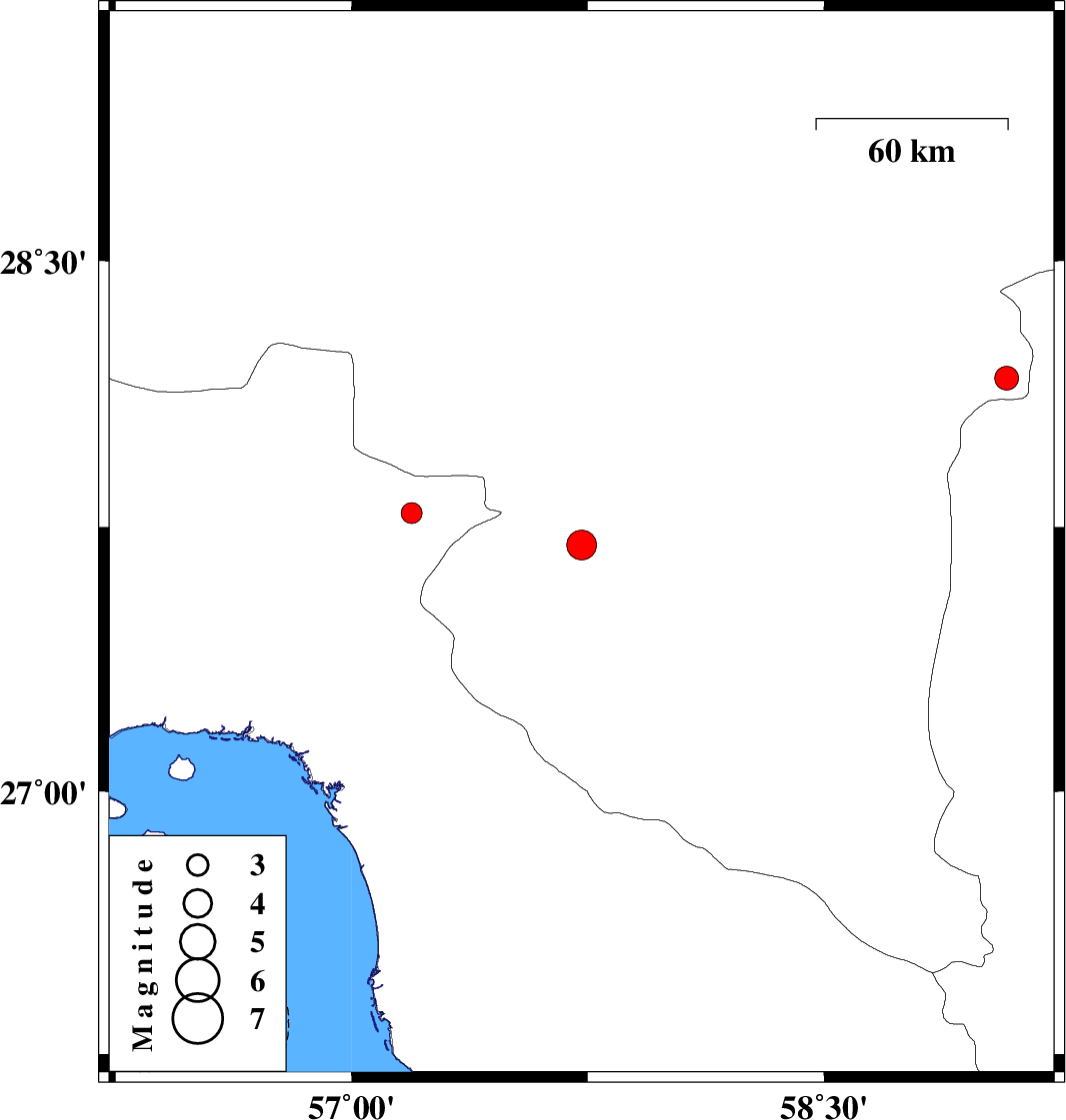 2014/09/24 | 18:44:10.0 | 22:14:10.0 | 27.7 | 57.73 | 14 | ML:4.2 | Kerman Province, 28 km South of Kahnuj | ||