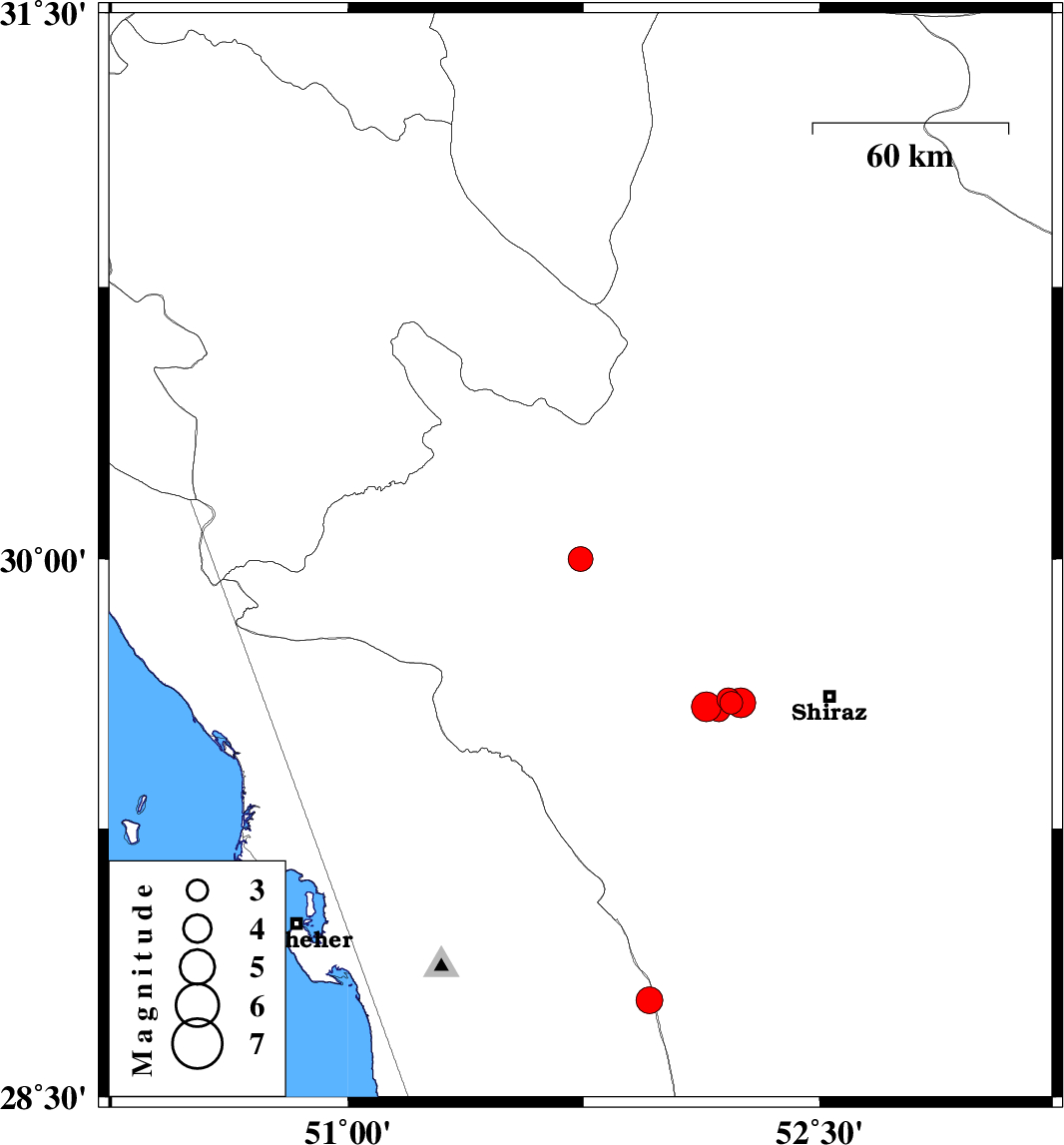 2014/08/27 | 09:09:31.2 | 13:39:31.2 | 29.58 | 52.18 | 18 | ML:3.2 | Fars Province, 34 km West of Shiraz |