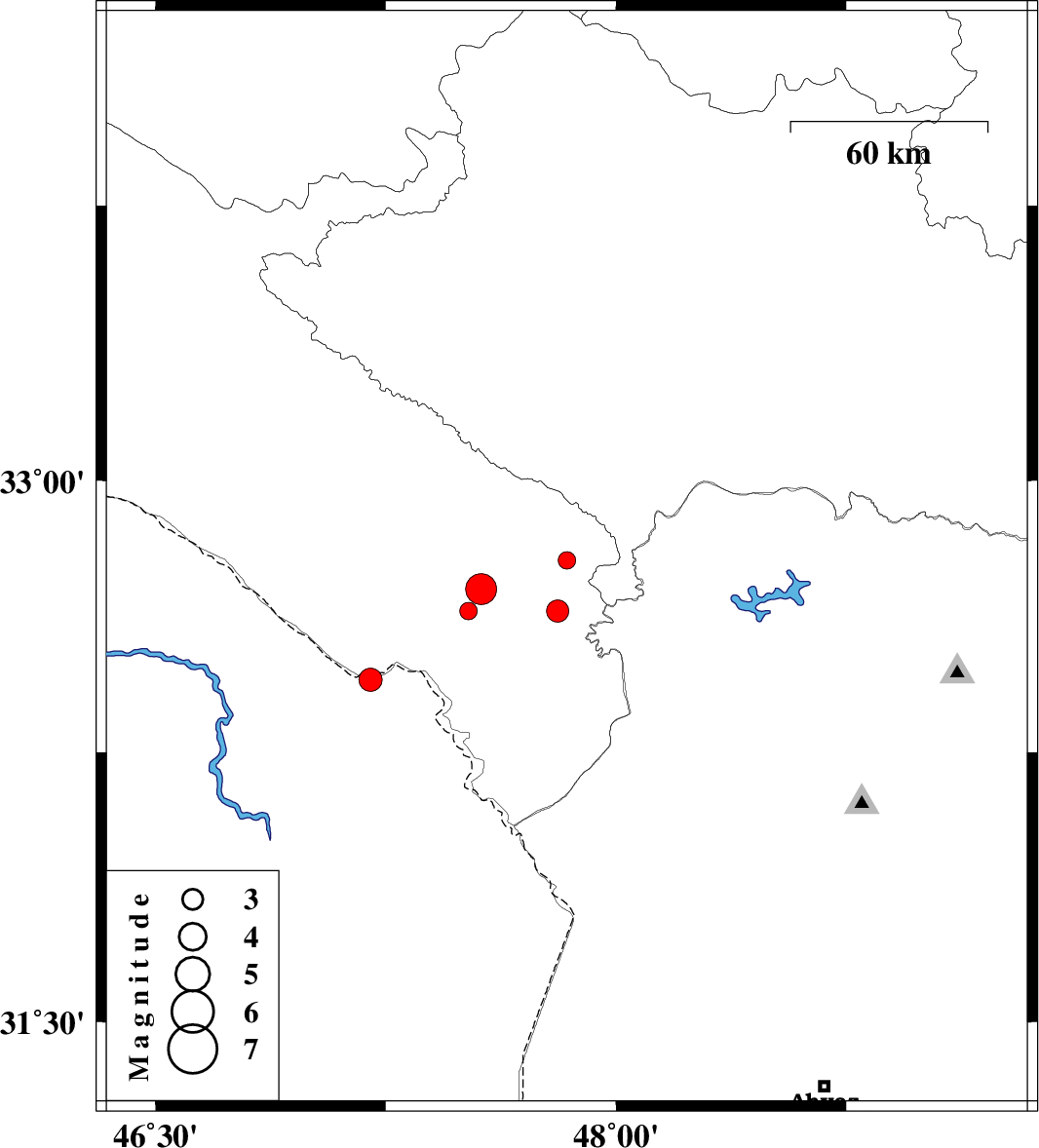 2014/09/28 | 00:00:40.1 | 03:30:40.1 | 32.7 | 47.56 | 14 | ML:4.5 | Ilam Province, 28 km East of Dehloran | ||