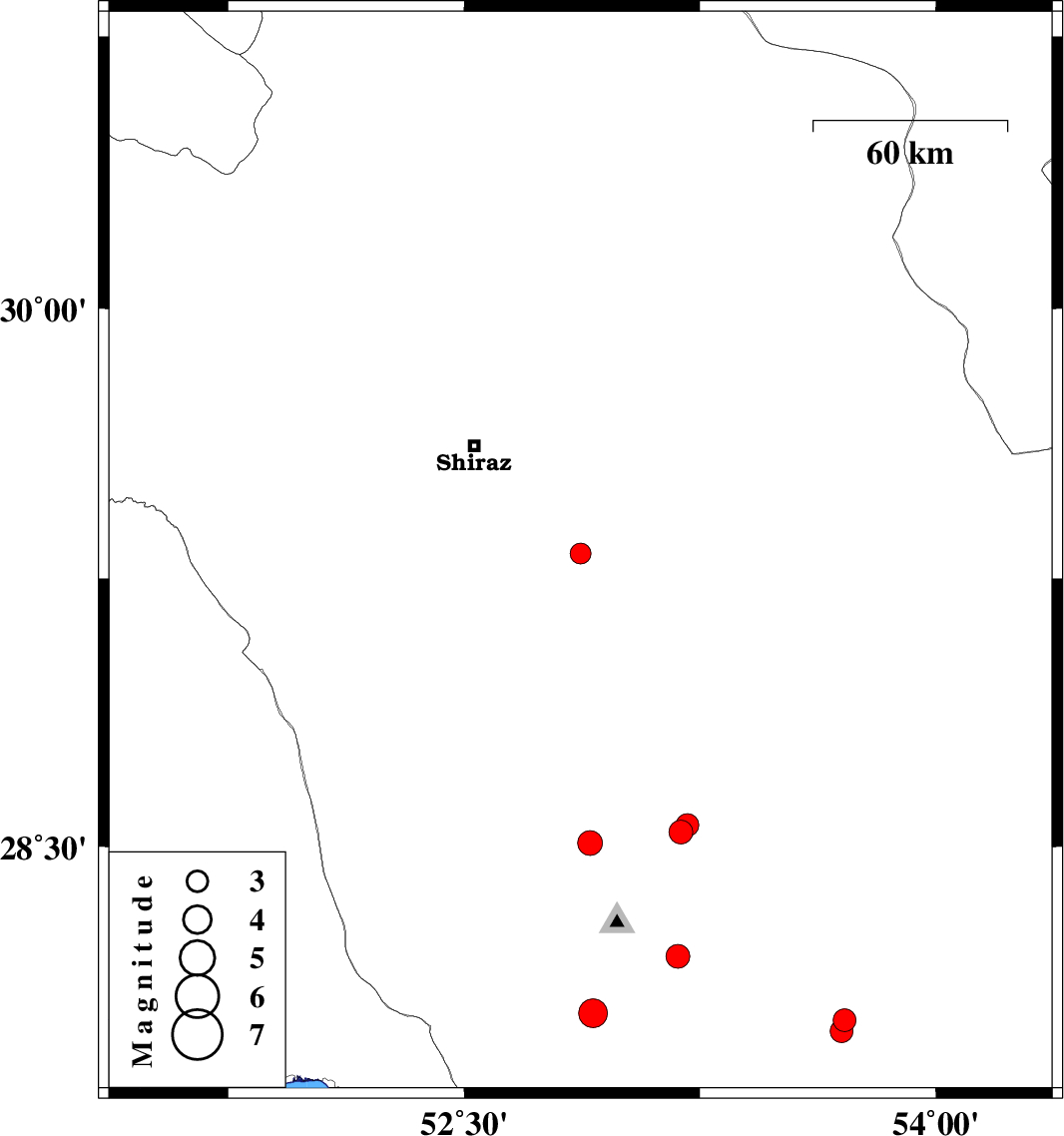 2014/10/04 | 02:26:12.2 | 05:56:12.2 | 28.51 | 52.9 | 6 | ML:3.5 | Fars Province, 14 km West of Qir va Karzin |