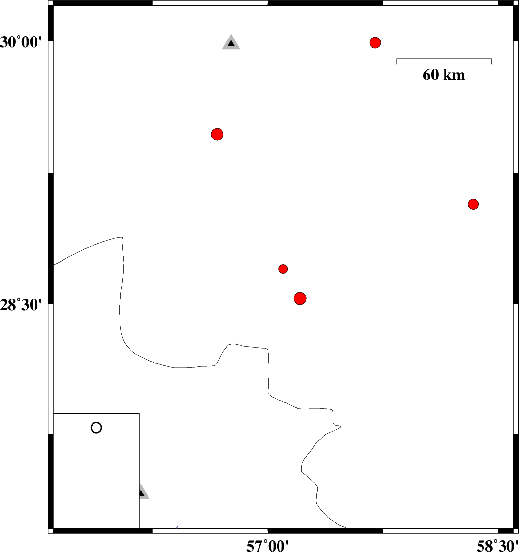 2014/09/30 | 22:44:00.3 | 02:14:00.3 | 29.99 | 57.7 | 17 | ML:3.3 | Kerman Province, 69 km South-East of Kerman | ||