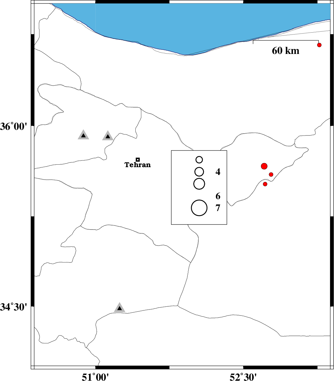 2014/10/05 | 09:43:43.9 | 13:13:43.9 | 35.98 | 52.26 | 6 | ML:1.8 | Mazandaran Province, 33 km North-East of Damavand | ||