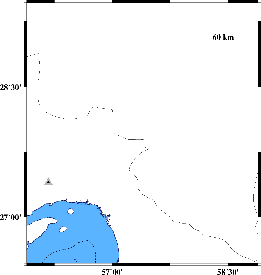 2014/10/08 | 05:59:39.8 | 09:29:39.8 | 27.96 | 57.39 | 14 | ML:3.3 | Kerman Province, 30 km West of Kahnuj | ||