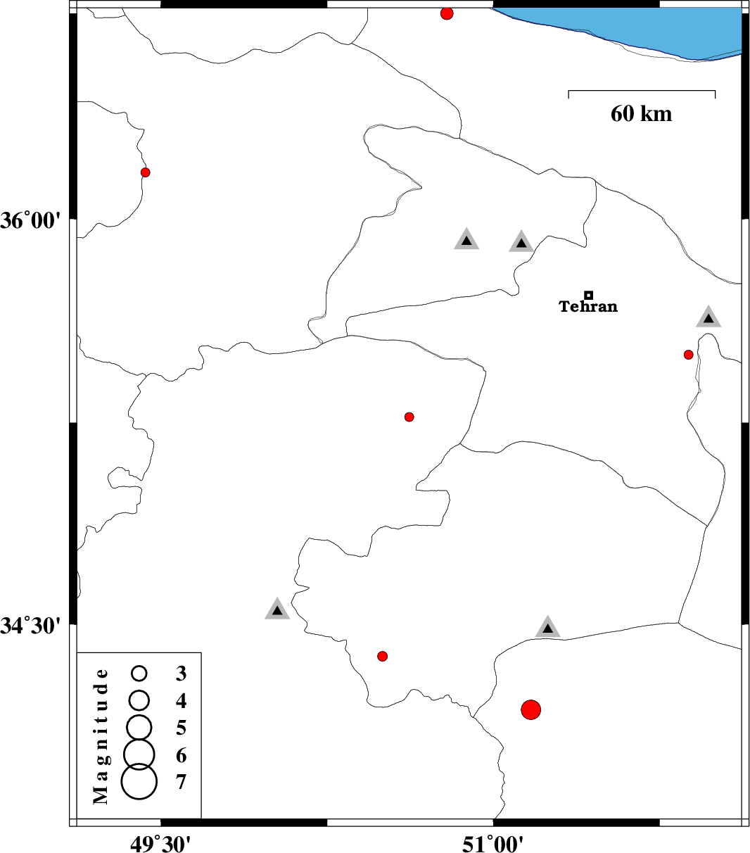 2014/10/08 | 03:36:27.9 | 07:06:27.9 | 35.5 | 51.88 | 15 | ML:1.9 | Tehran Province, 19 km East of Pakdasht |