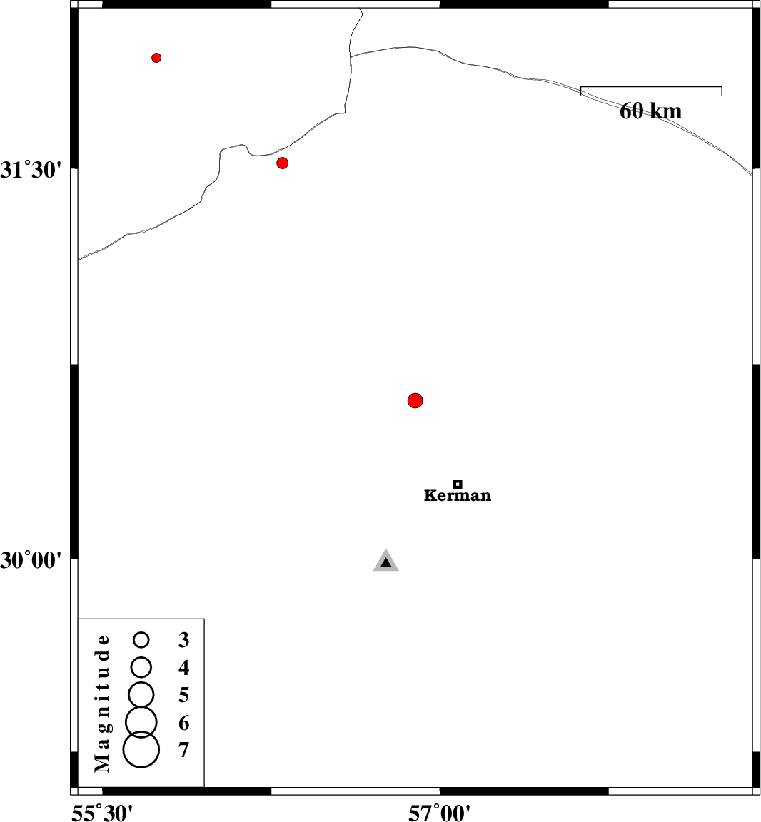 2014/10/14 | 09:46:12.9 | 13:16:12.9 | 31.52 | 56.3 | 17 | ML:2.2 | Kerman Province, 56 km North-West of Ravar |