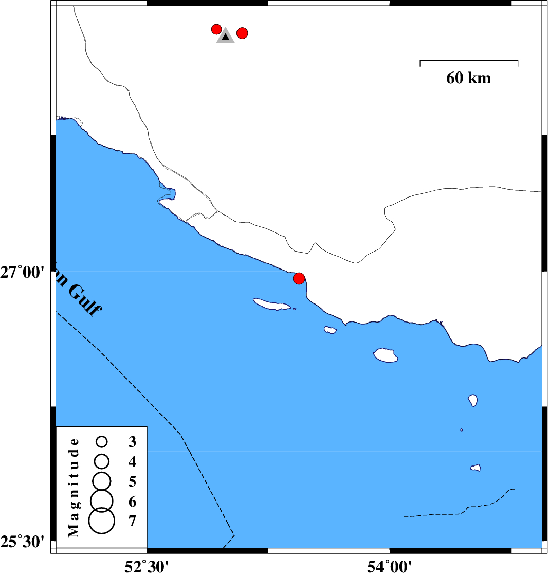 2014/10/21 | 02:04:16.5 | 05:34:16.5 | 26.96 | 53.44 | 46 | ML:3.3 | Persian Gulf, 49 km South-East of Lamerd | ||