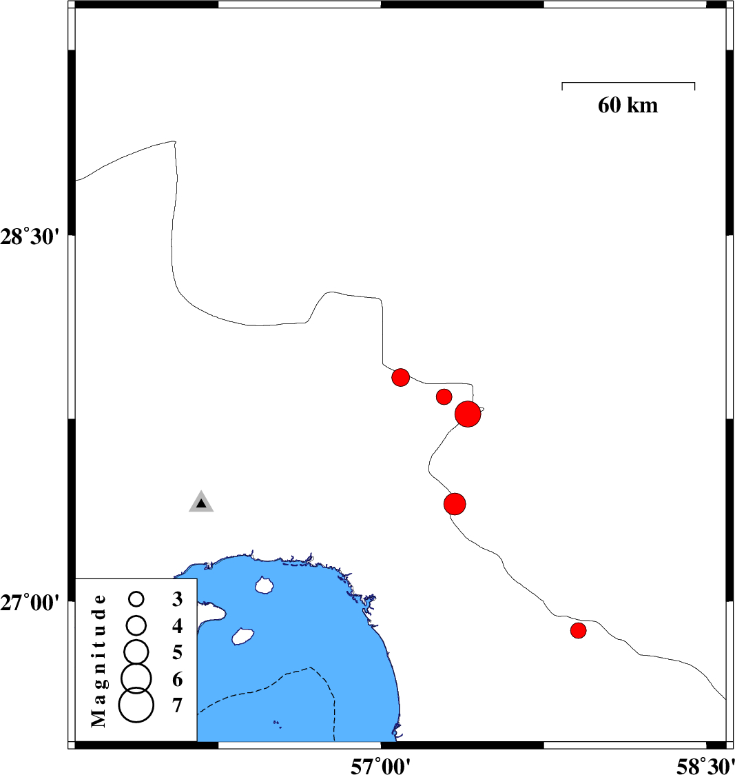2014/10/21 | 22:47:01.5 | 02:17:01.5 | 27.4 | 57.34 | 15 | ML:4.5 | Kerman Province, 10 km Dehbarez |
