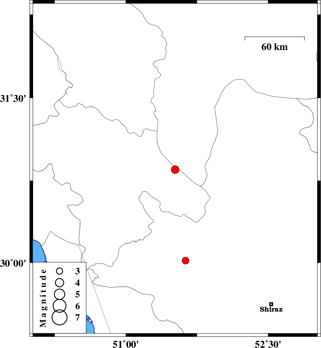 2014/10/27 | 20:11:21.0 | 23:41:21.0 | 30.02 | 51.63 | 15 | ML:3.4 | Fars Province, 15 km East of Nurabad |