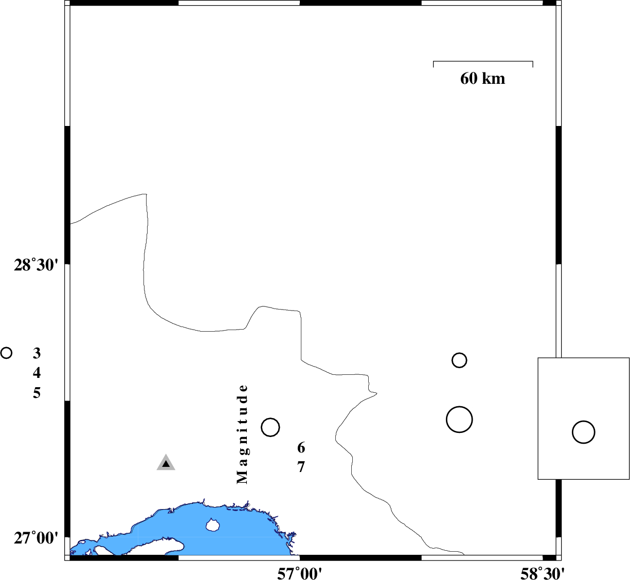 2014/10/26 | 10:13:46.7 | 13:43:46.7 | 27.97 | 57.82 | 15 | ML:3.6 | Kerman Province, 13 km East of Kahnuj | ||