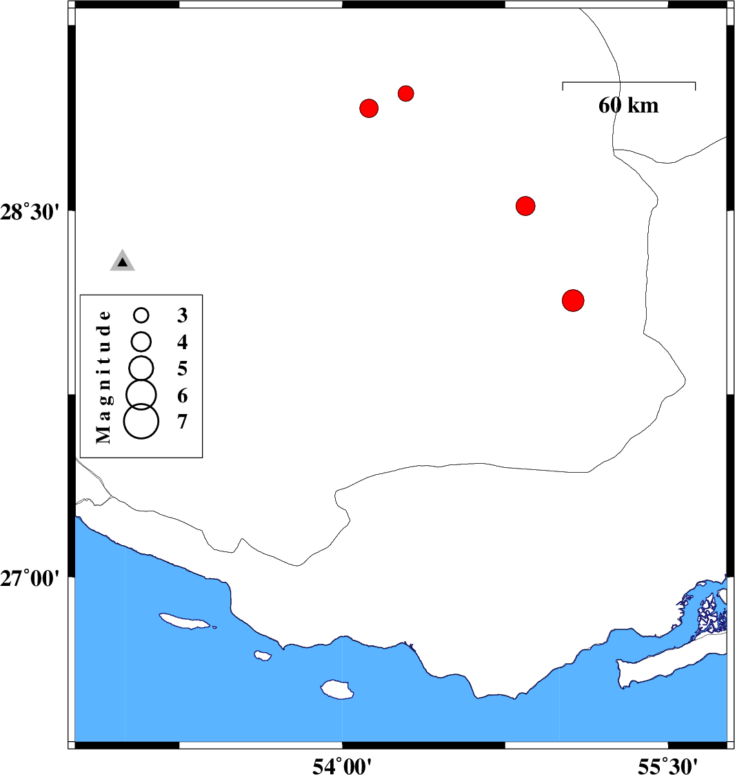 2014/11/02 | 11:55:17.8 | 15:25:17.8 | 27.36 | 54.82 | 14 | ML:4 | Hormozgan Province, 48 km North-East of Bastak |
