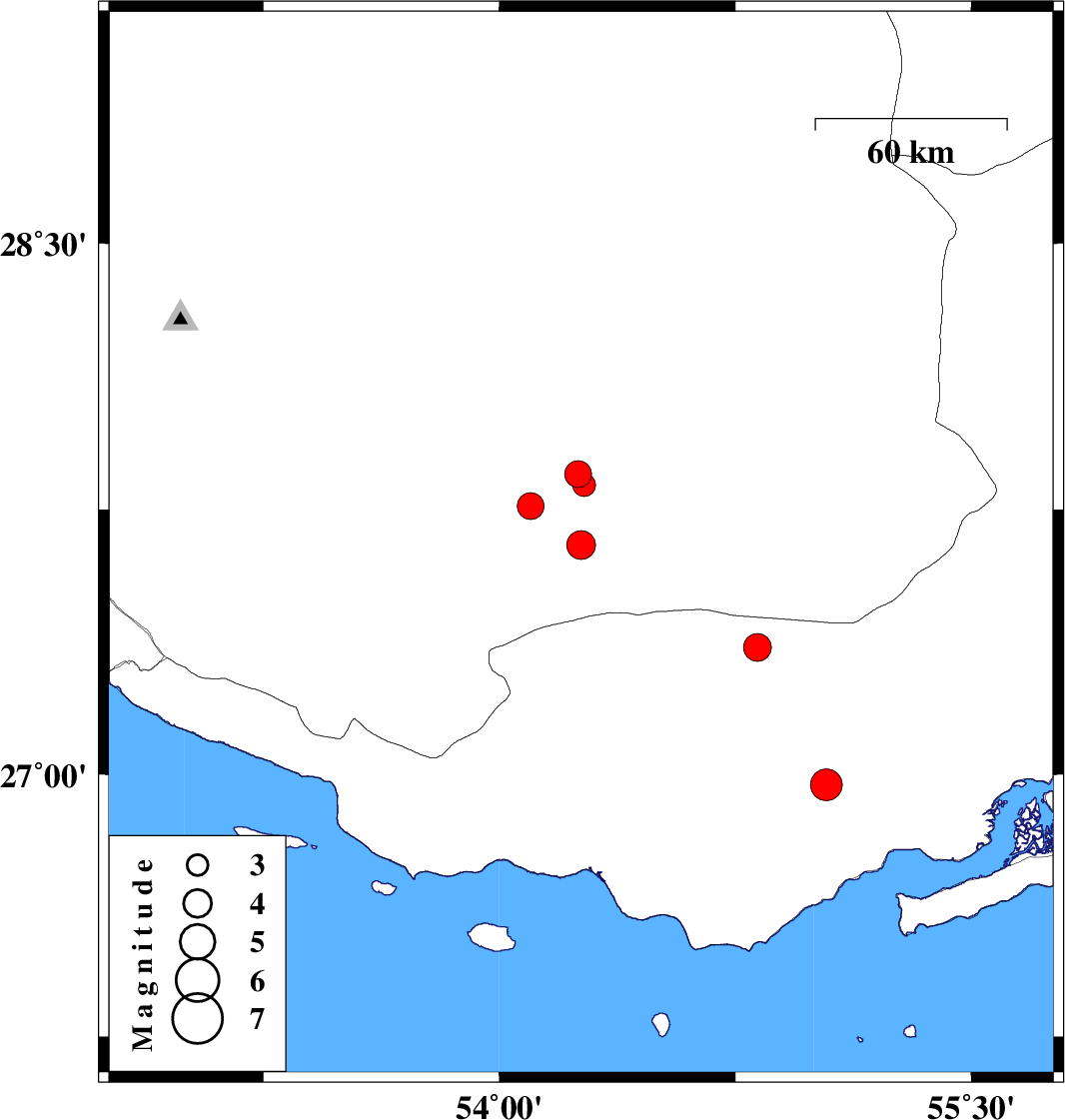 2014/11/06 | 01:20:48.7 | 04:50:48.7 | 27.82 | 54.27 | 29 | ML:3.3 | Fars Province, 17 km North of Lar | ||