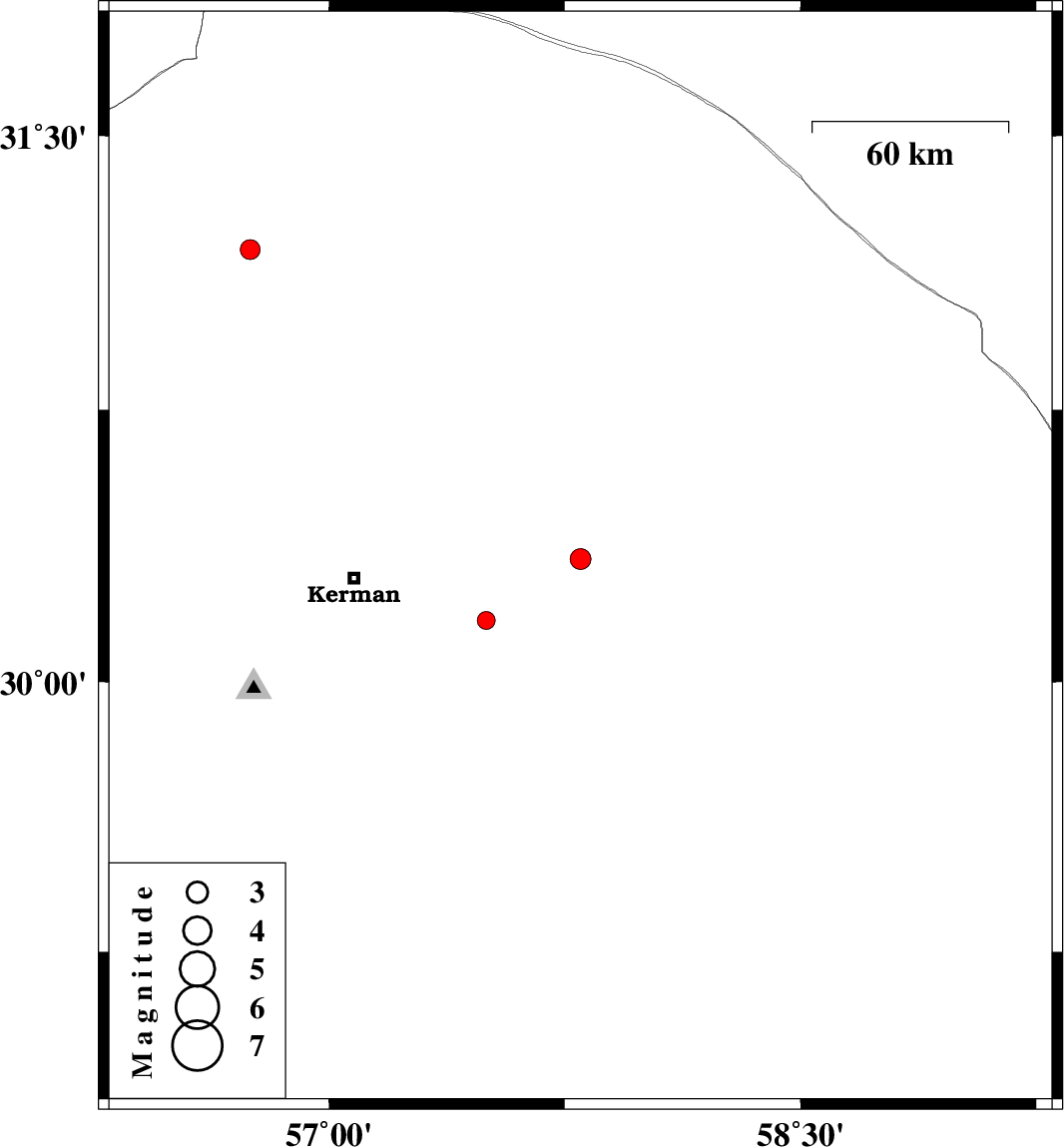 2014/11/11 | 20:58:41.0 | 00:28:41.0 | 30.34 | 57.8 | 14 | ML:2.9 | Kerman Province, 69 km East of Kerman | ||