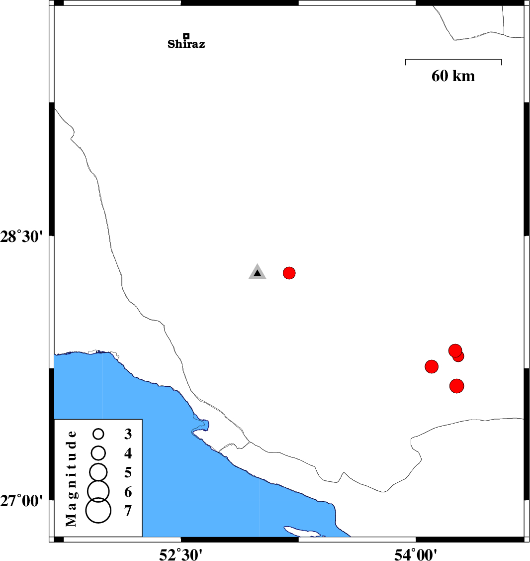 2014/11/06 | 01:20:48.7 | 04:50:48.7 | 27.82 | 54.27 | 29 | ML:3.3 | Fars Province, 17 km North of Lar | ||