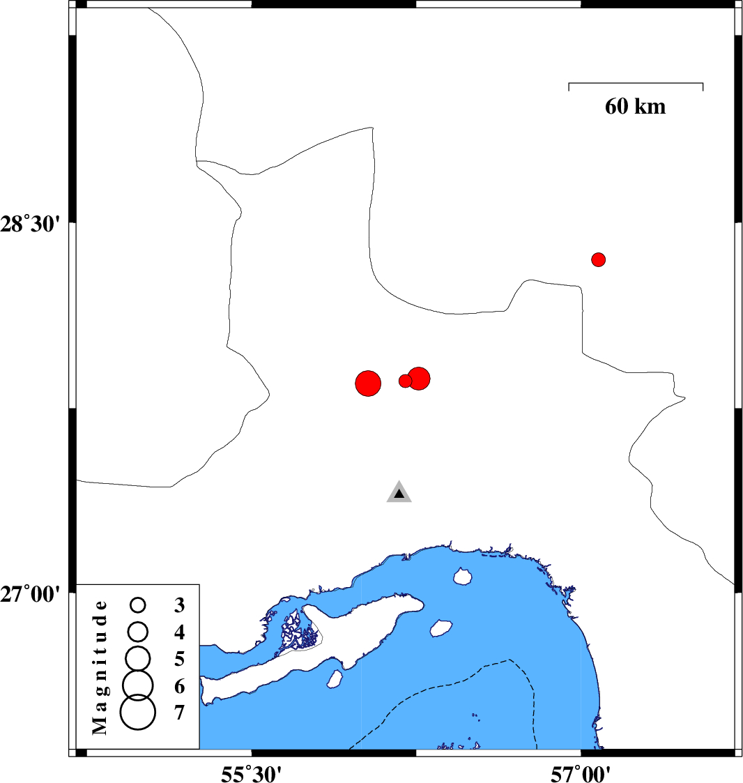 2014/11/06 | 18:43:30.2 | 22:13:30.2 | 26.97 | 55.04 | 16 | ML:4.5 | Hormozgan Province, 53 km North-East of Bandar-e lengeh |
