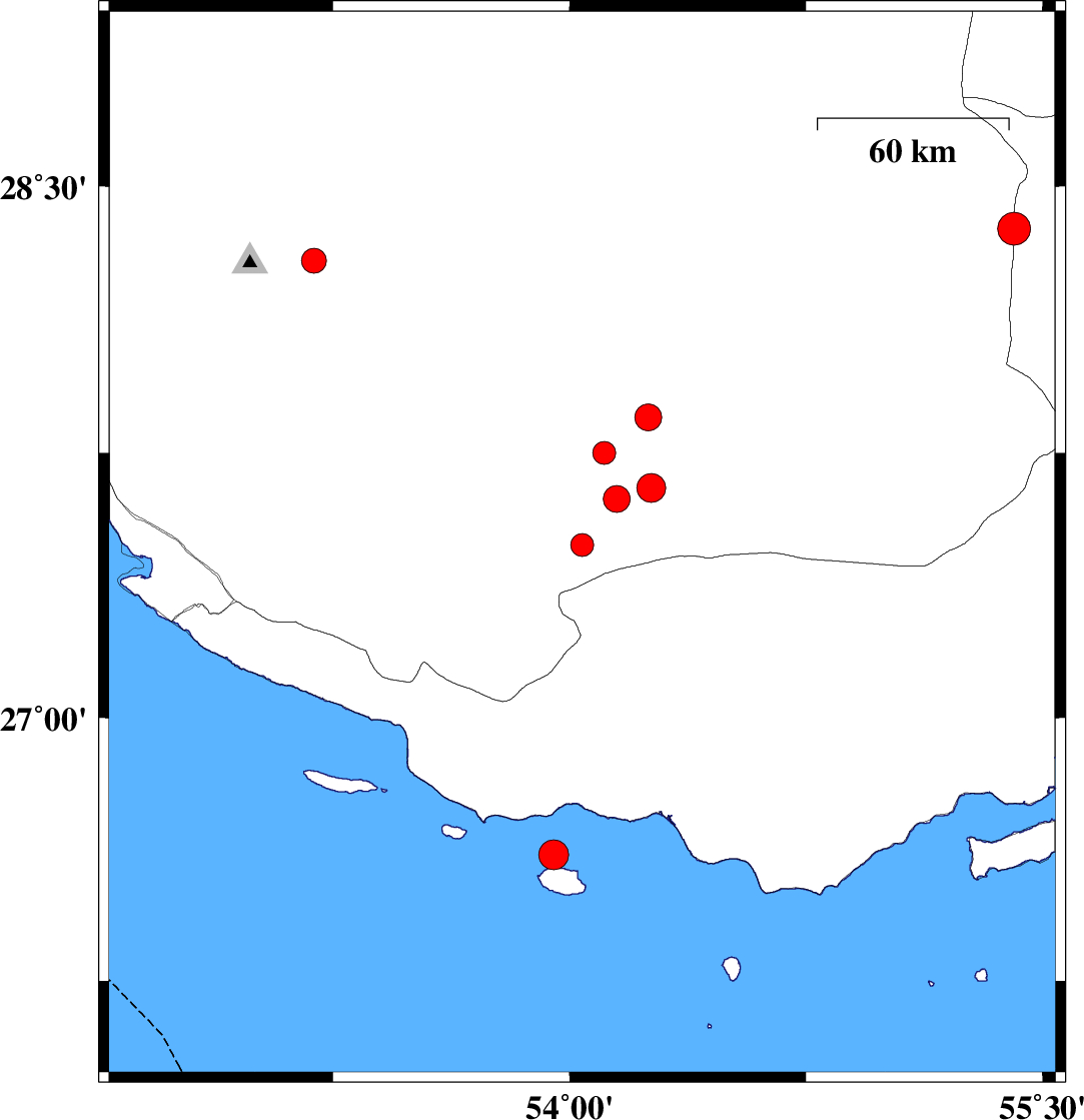 2014/11/15 | 11:07:52.8 | 14:37:52.8 | 27.49 | 54.04 | 14 | ML:3.3 | Fars Province, 36 km South-West of Lar | ||