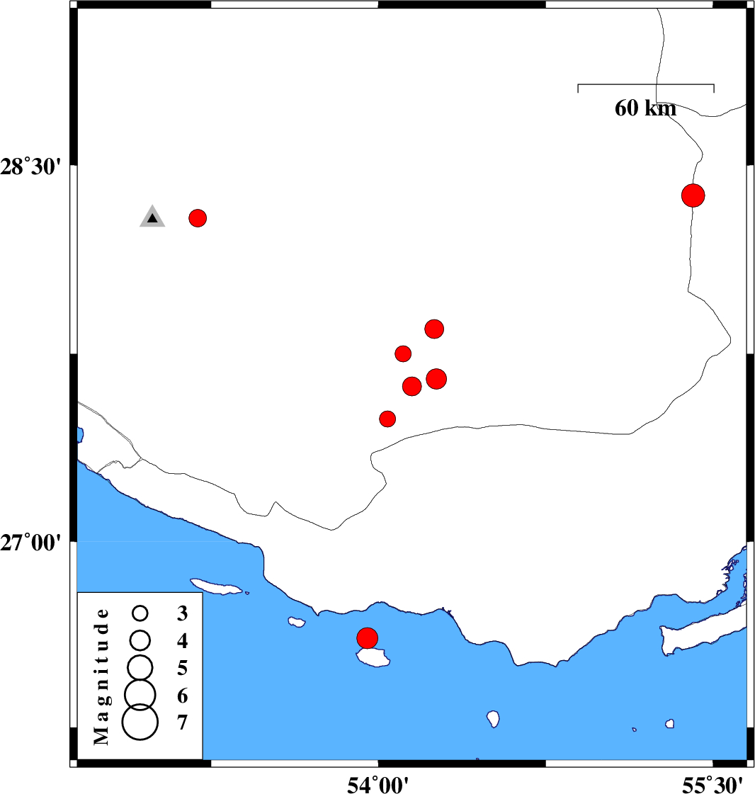2014/11/08 | 22:13:04.2 | 01:43:04.2 | 27.85 | 54.25 | 14 | ML:3.8 | Fars Province, 21 km North of Lar |