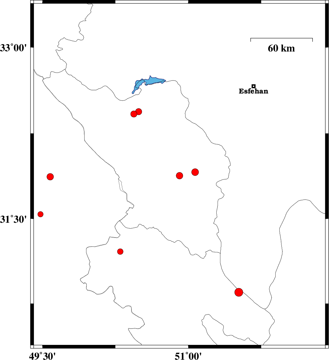 2014/11/04 | 13:04:16.7 | 16:34:16.7 | 31.91 | 51.07 | 14 | ML:3.3 | Chaharmahal Bakhtiari Province, 21 km West of Borujen | ||