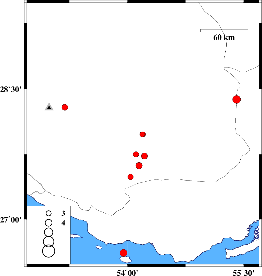 2014/11/20 | 02:38:59.4 | 06:08:59.4 | 27.98 | 54.19 | 14 | ML:2.9 | Fars Province, 36 km North-West of Lar | ||