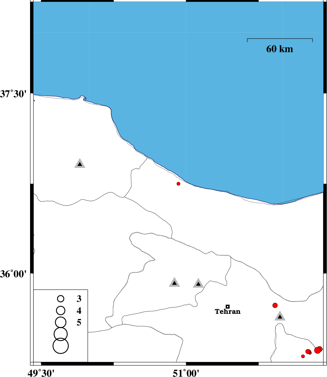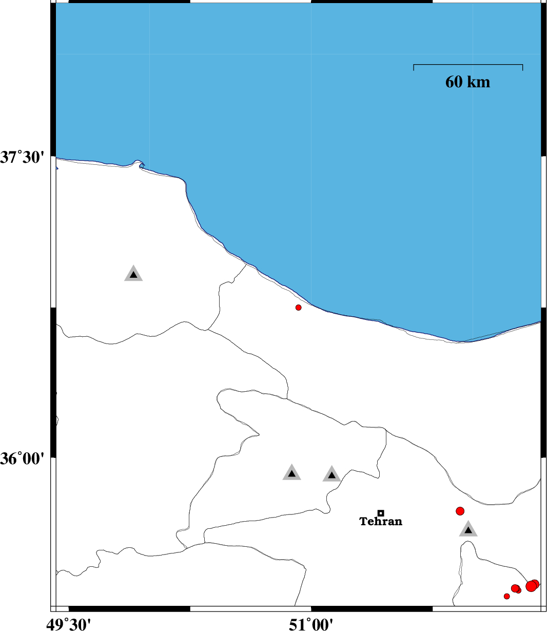 2014/11/26 | 04:03:03.7 | 07:33:03.7 | 35.36 | 52.38 | 16 | ML:2.5 | Tehran Province, 16 km North of Garmsar |