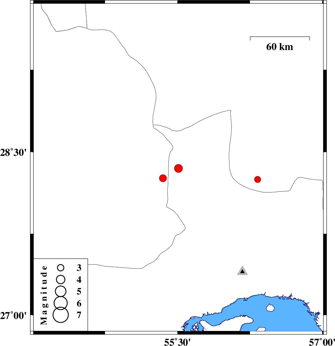 2014/11/29 | 17:40:01.2 | 21:10:01.2 | 28.26 | 55.35 | 17 | ML:3.4 | Fars Province, 55 km West of Hajiabad | ||