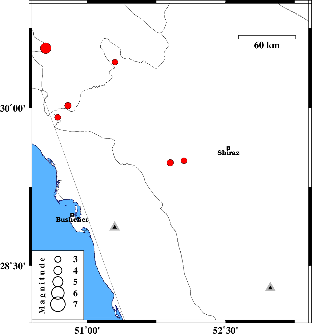 2014/12/26 | 19:51:46.4 | 23:21:46.4 | 29.48 | 51.9 | 6 | ML:3.3 | Fars Province, 29 km South-East of Kazerun | ||
