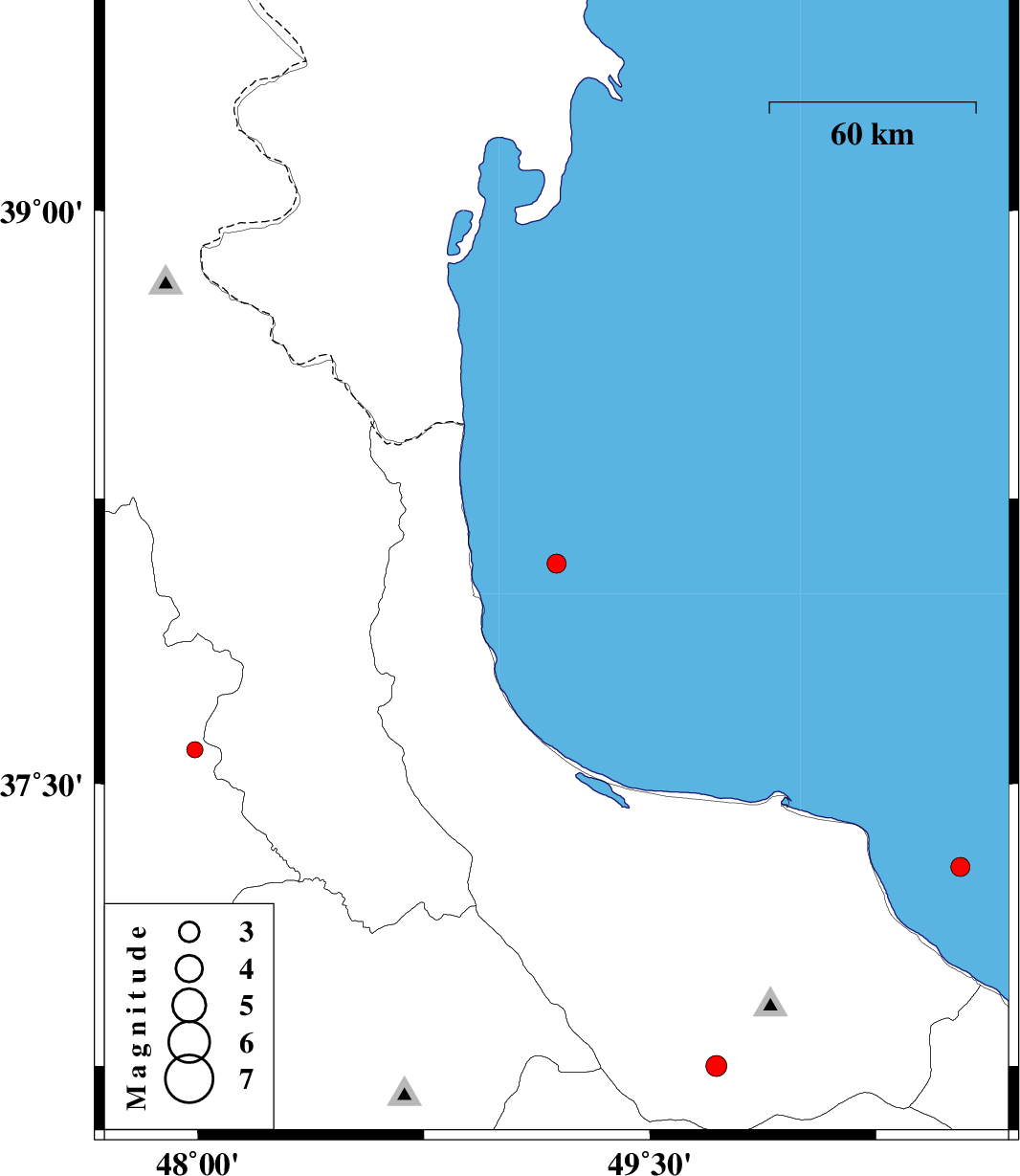2015/01/04 | 12:51:07.1 | 16:21:07.1 | 37.28 | 50.53 | 27 | ML:2.8 | Caspian Sea, 27 km North-East of Rudsar | ||