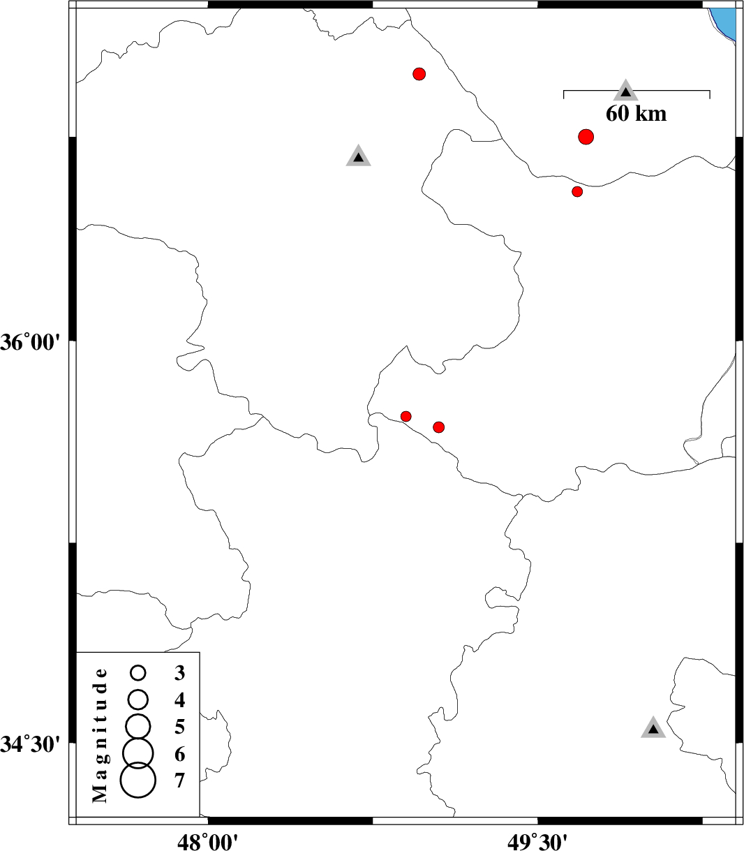 2015/01/11 | 03:07:29.9 | 06:37:29.9 | 35.72 | 48.9 | 18 | ML:2.1 | Ghazvin Province, 40 km North-West of Razan | ||