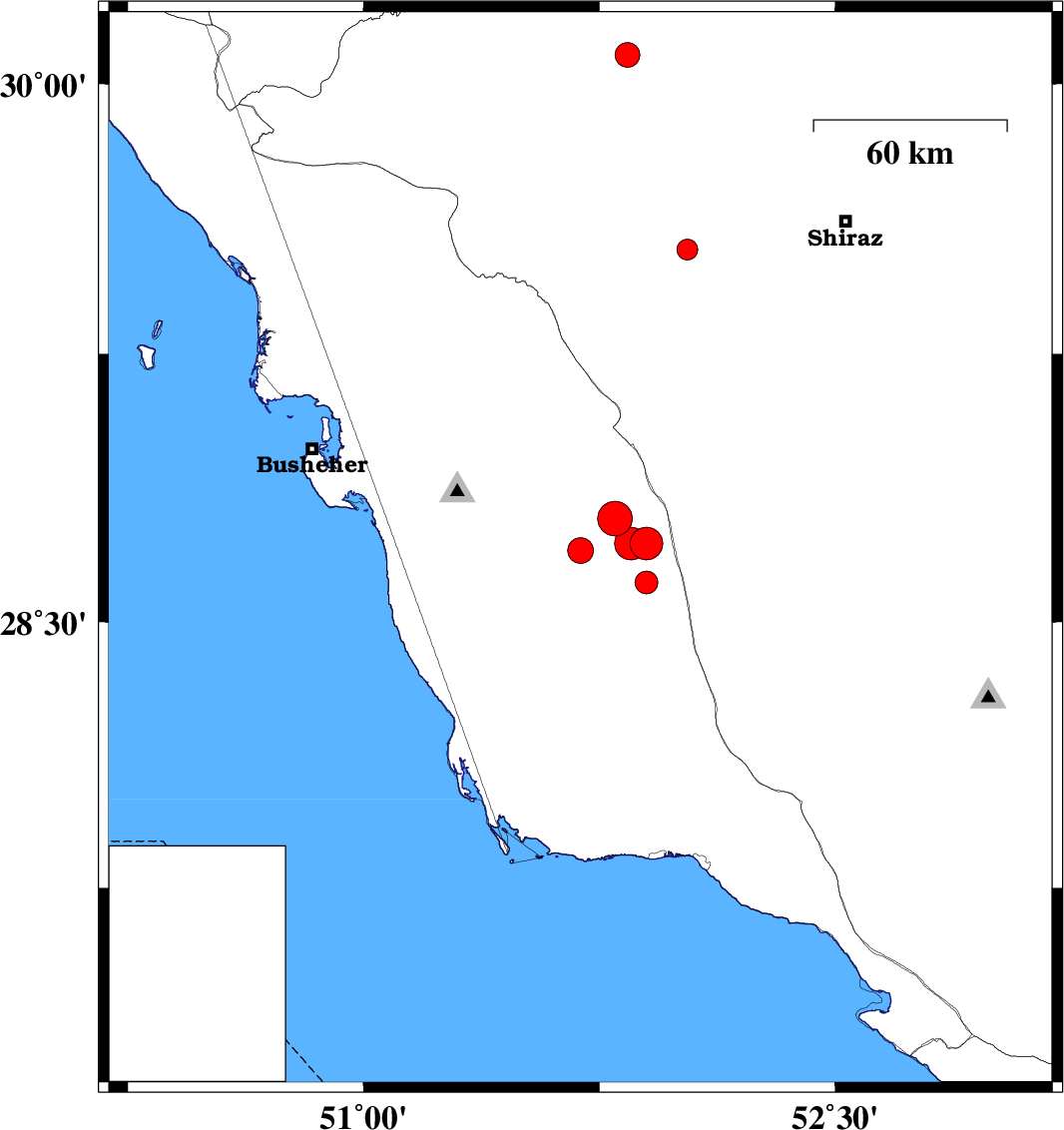 2015/01/10 | 17:03:07.3 | 20:33:07.3 | 28.79 | 51.8 | 19 | ML:5 | Bushehr Province, 29 km West of Farashband | ||