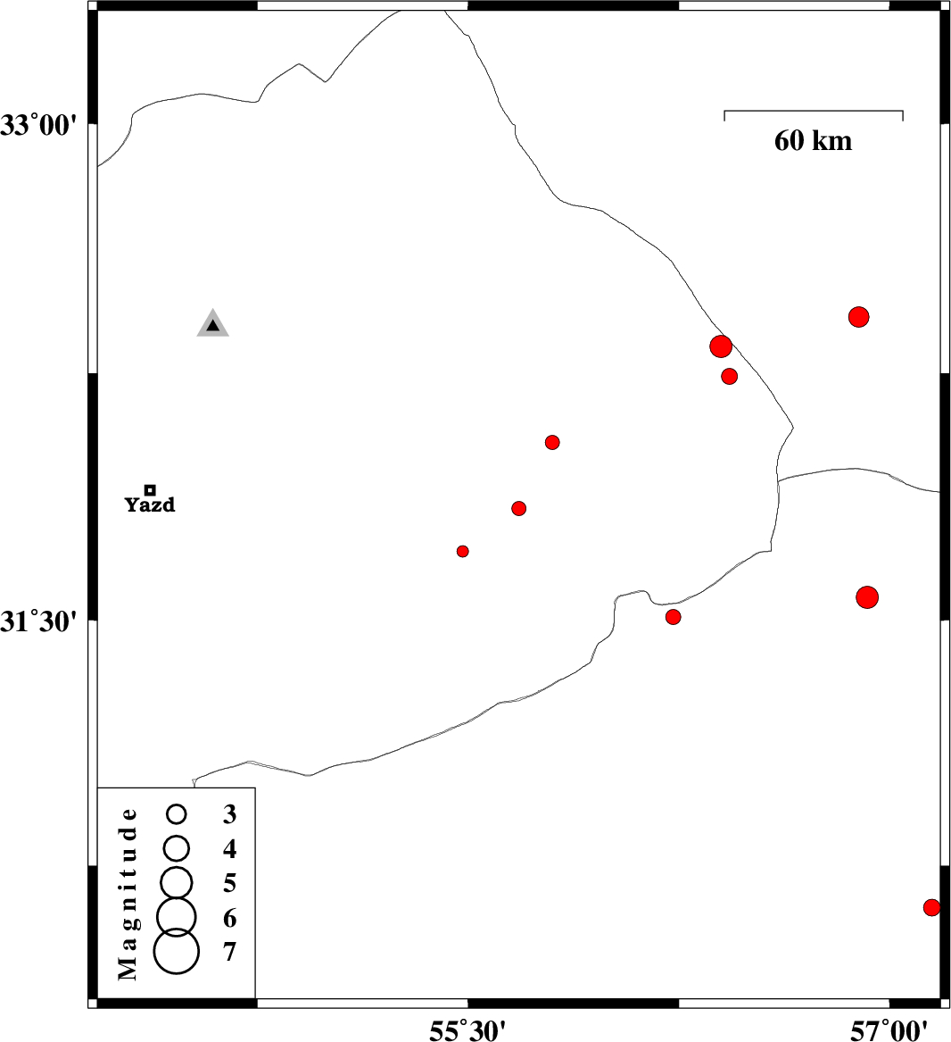 2015/01/07 | 23:42:25.3 | 03:12:25.3 | 32.04 | 55.8 | 14 | ML:2.3 | Yazd Province, 62 km North-East of Bafq | ||