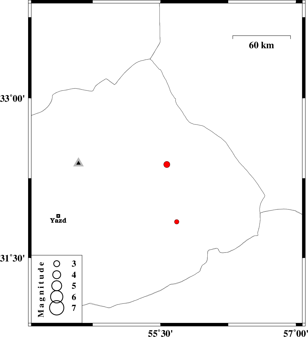 2015/01/15 | 09:14:46.6 | 12:44:46.6 | 31.84 | 55.68 | 14 | ML:2.2 | Yazd Province, 37 km North-East of Bafq |