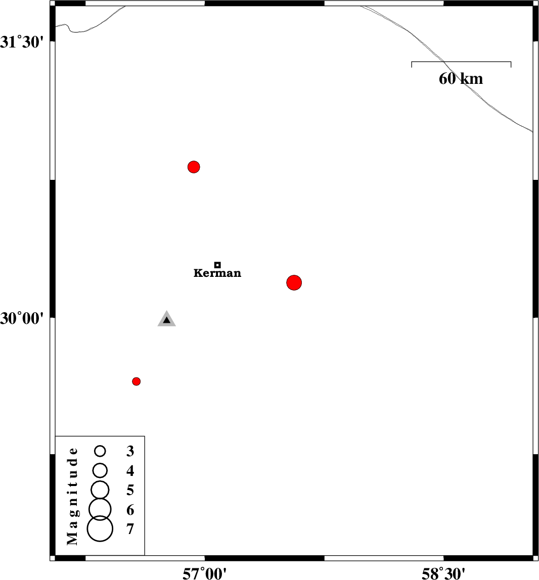 2015/02/13 | 01:00:45.2 | 04:30:45.2 | 30.19 | 57.56 | 14 | ML:4.3 | Kerman Province, 48 km East of Kerman | ||