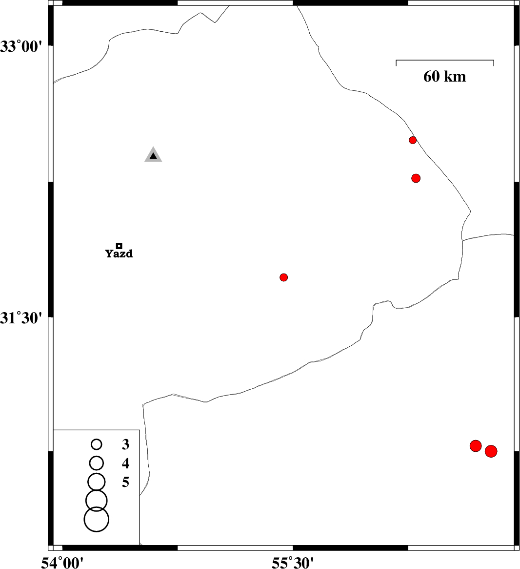 2015/02/19 | 10:49:09.8 | 14:19:09.8 | 31.72 | 55.44 | 6 | ML:2.3 | Yazd Province, 14 km North of Bafq | ||