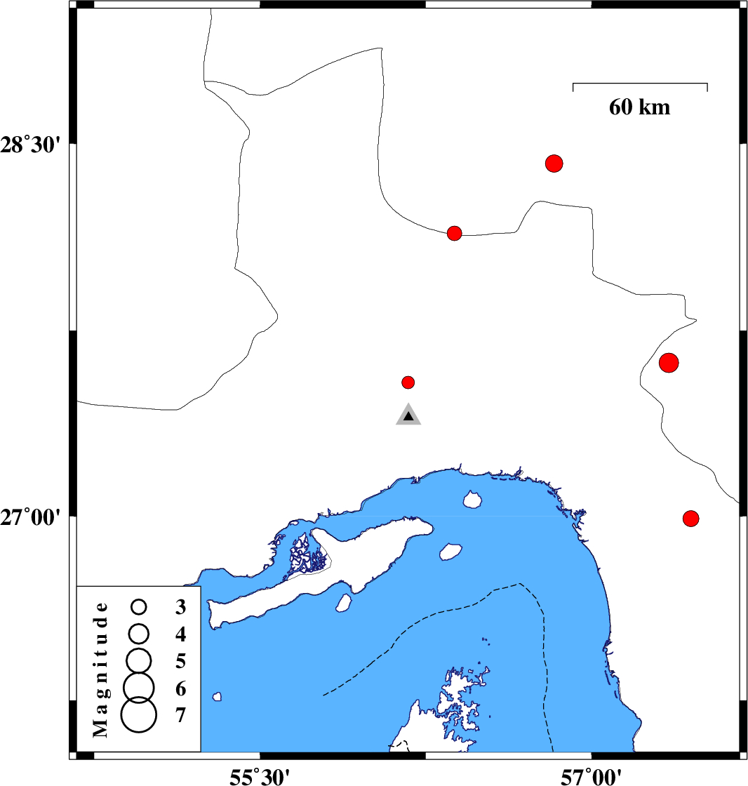 2015/03/13 | 06:00:36.6 | 09:30:36.6 | 27.62 | 57.35 | 14 | ML:4 | Kerman Province, 24 km North-East of Dehbarez |