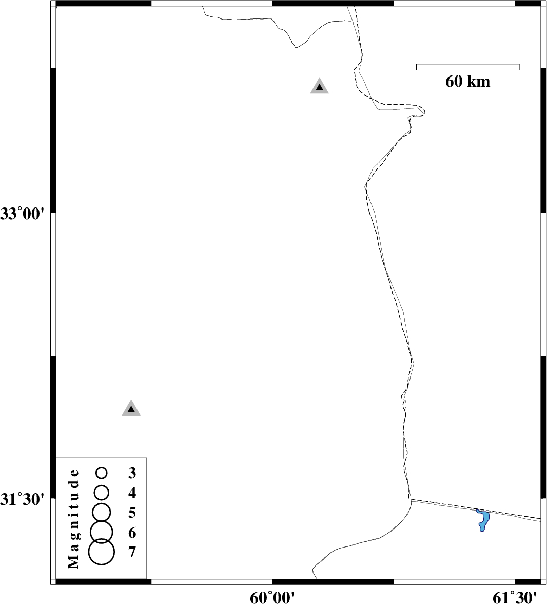 2015/04/11 | 17:53:14.4 | 22:23:14.4 | 32.57 | 60.16 | 6 | ML:2.9 | Khorasan(south) Province, 35 km East of Sarbisheh |