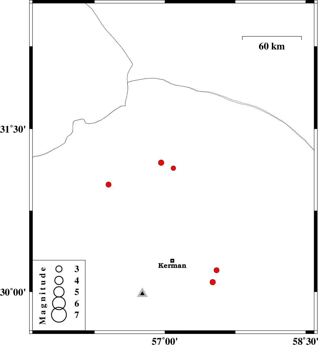 | 2015/04/12 | 06:58:30.9 | 11:28:30.9 | 30.2 | 57.55 | 14 | ML:2.5 | Kerman Province, 47 km East of Kerman | ||