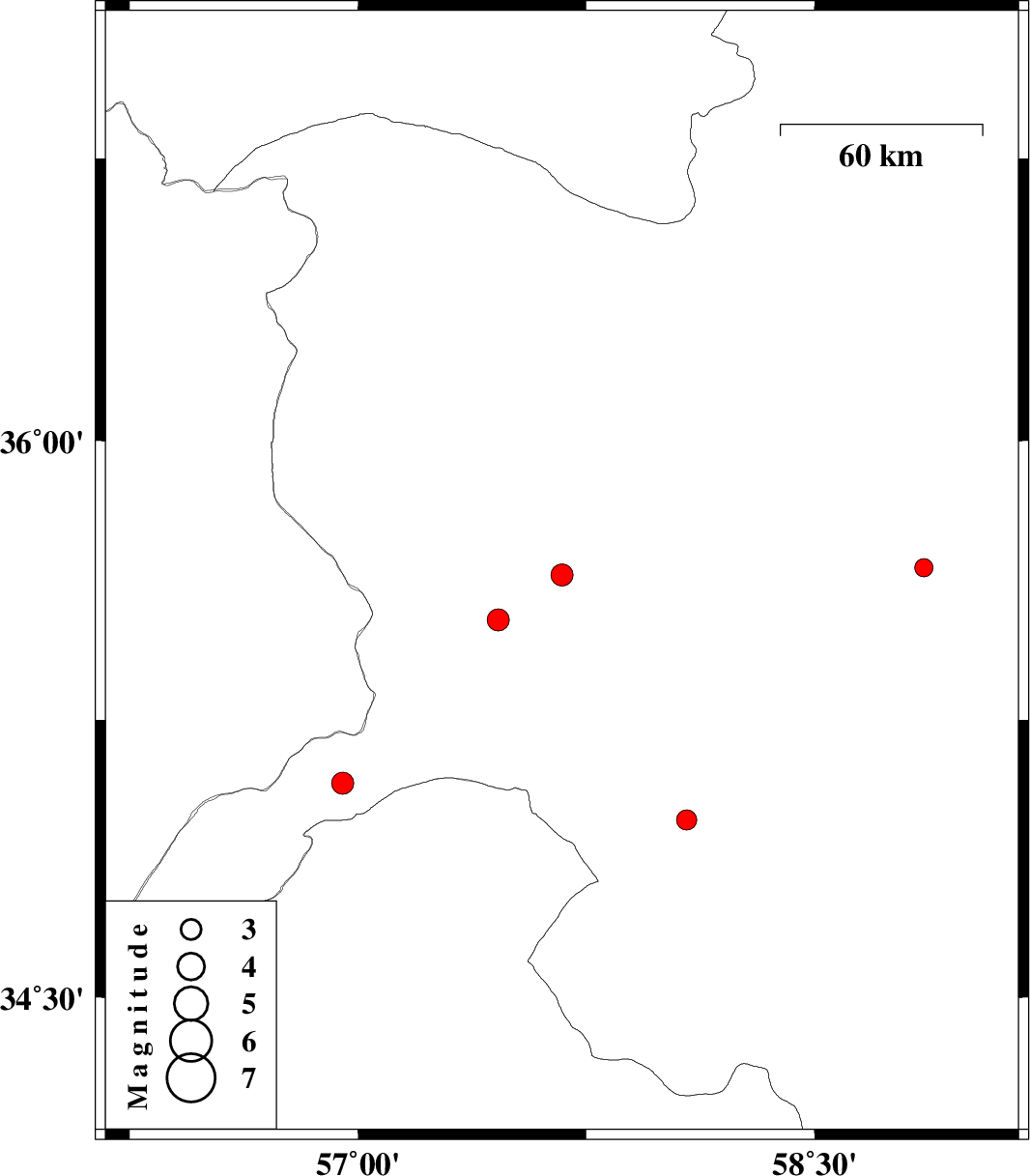2015/04/06 | 06:56:50.4 | 11:26:50.4 | 35.66 | 58.86 | 14 | ML:2.7 | Khorasan(center) Province, 60 km South of Neyshabur |