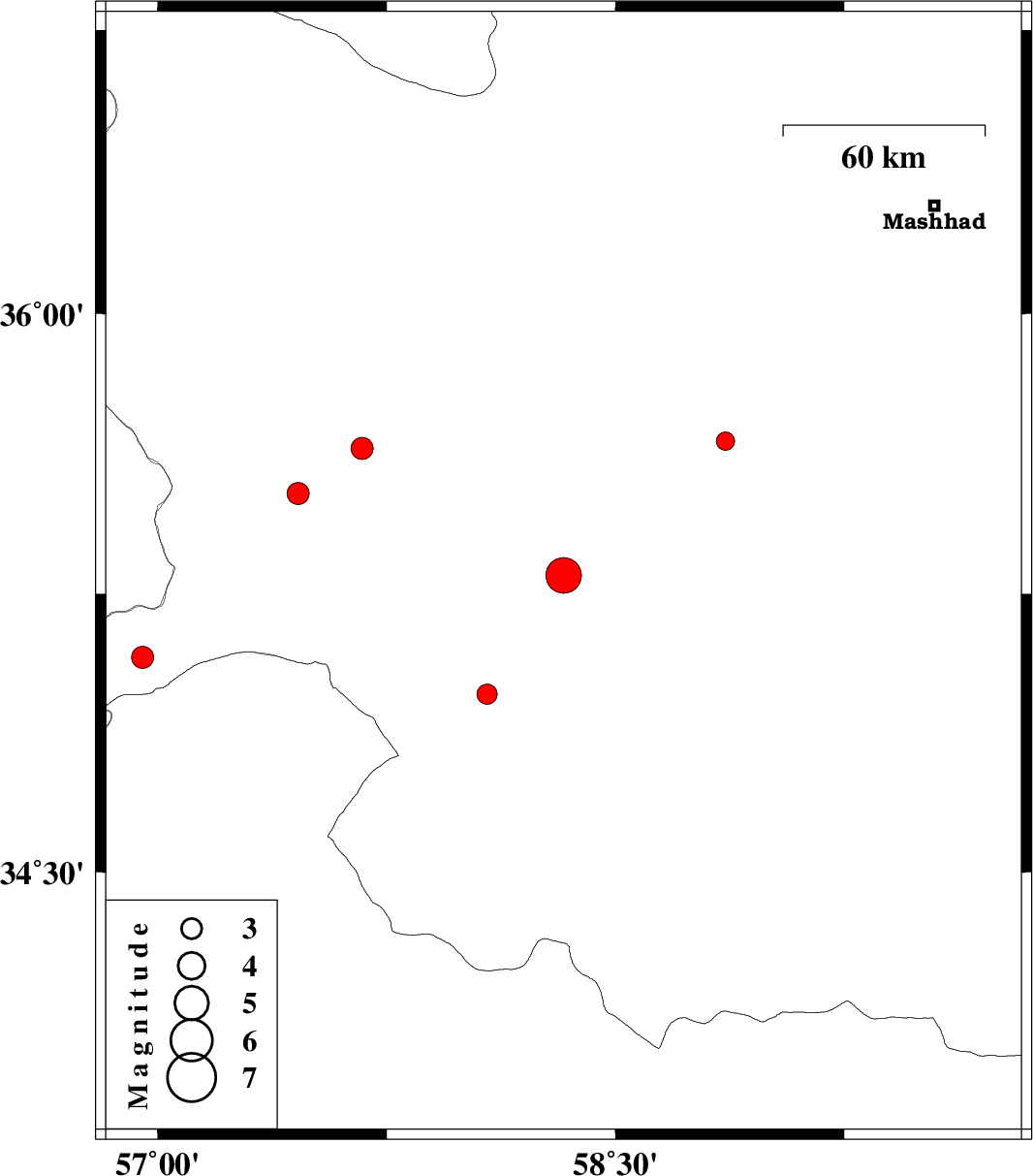 2015/04/06 | 06:56:50.4 | 11:26:50.4 | 35.66 | 58.86 | 14 | ML:2.7 | Khorasan(center) Province, 60 km South of Neyshabur |