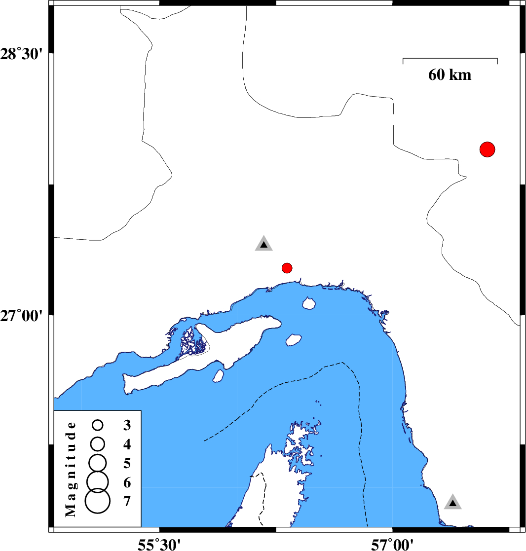 | 2015/05/15 | 16:45:06.7 | 21:15:06.7 | 27.27 | 56.32 | 20 | ML:3 | Hormozgan Province, 10 km Bandar-e abbas | ||