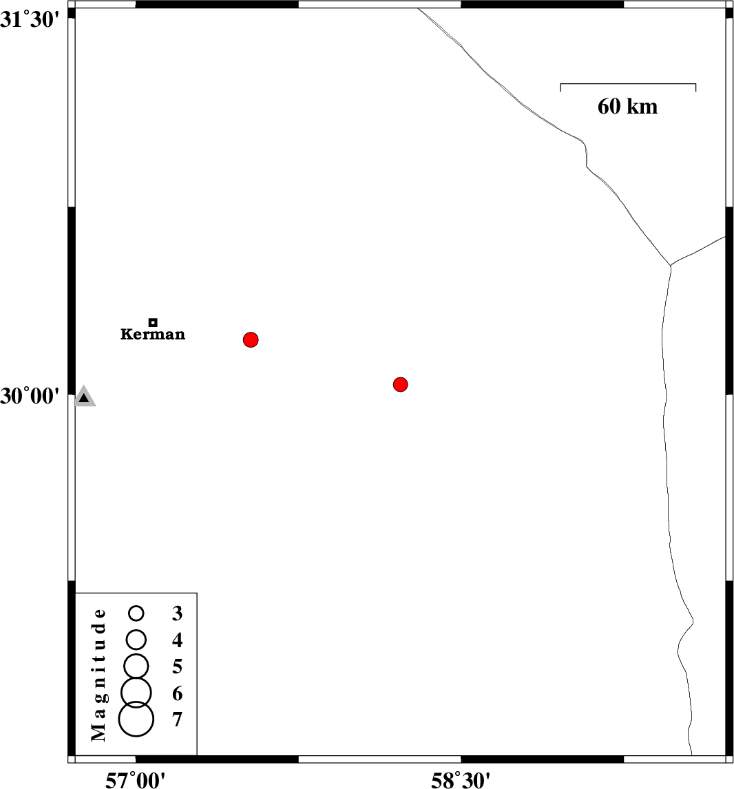 | 2015/05/18 | 11:03:31.3 | 15:33:31.3 | 30.04 | 58.22 | 15 | ML:3 | Kerman Province, 105 km North-West of Bam | ||