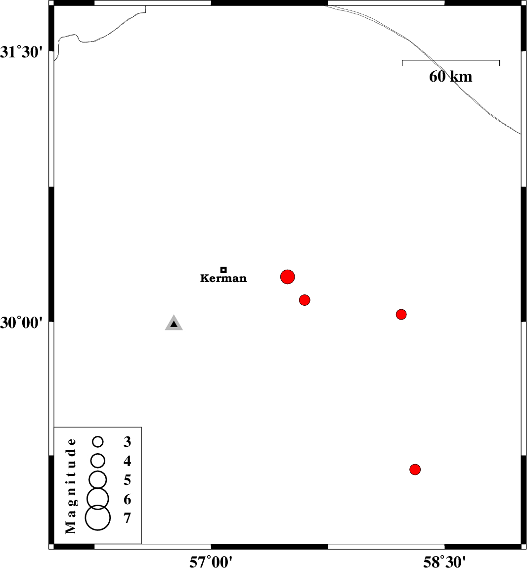 | 2015/05/18 | 11:03:31.3 | 15:33:31.3 | 30.04 | 58.22 | 15 | ML:3 | Kerman Province, 105 km North-West of Bam |