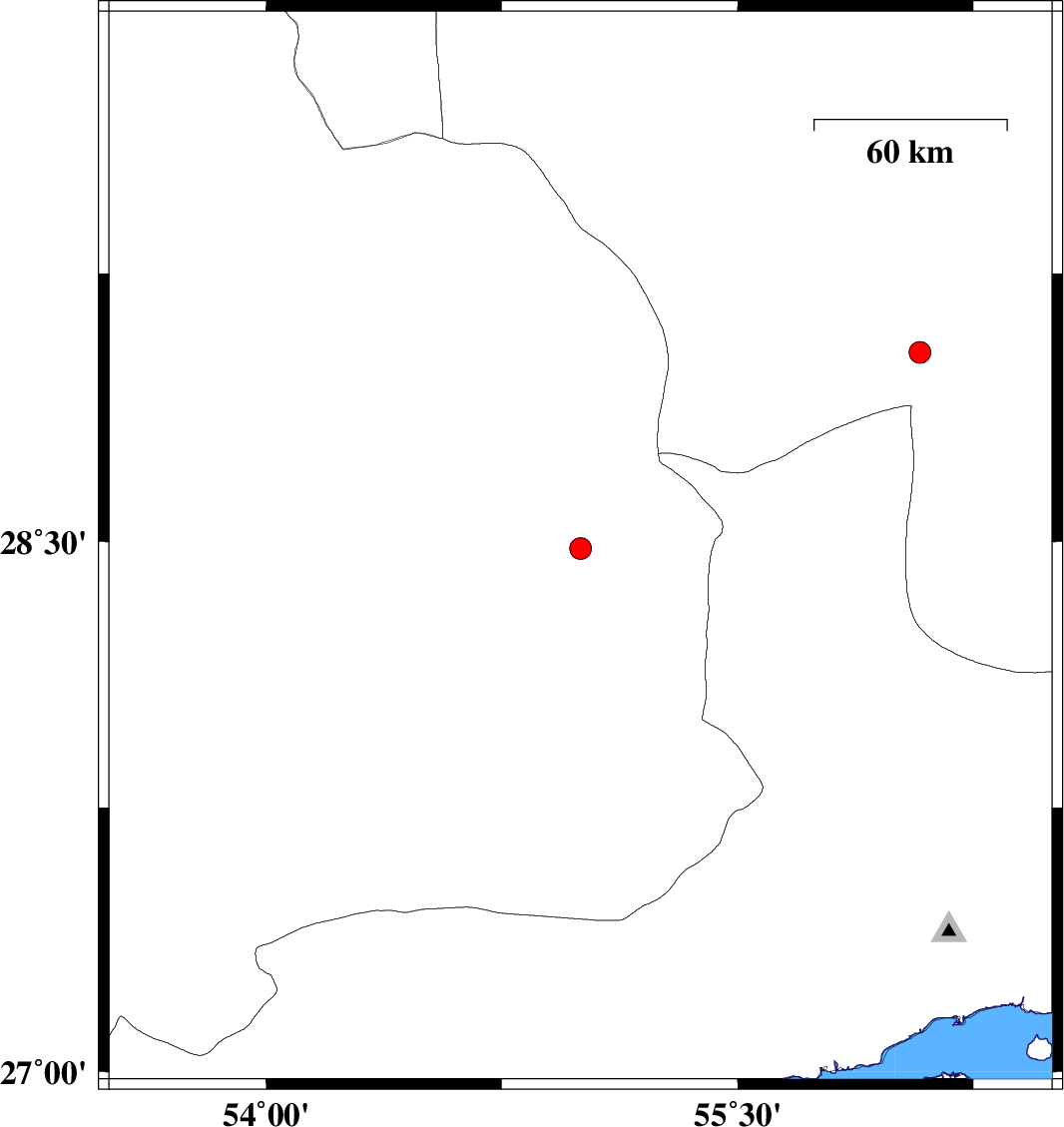| 2015/05/30 | 14:22:12.0 | 18:52:12.0 | 28.48 | 55 | 17 | ML:3.1 | Fars Province, 54 km South-East of Darab | ||