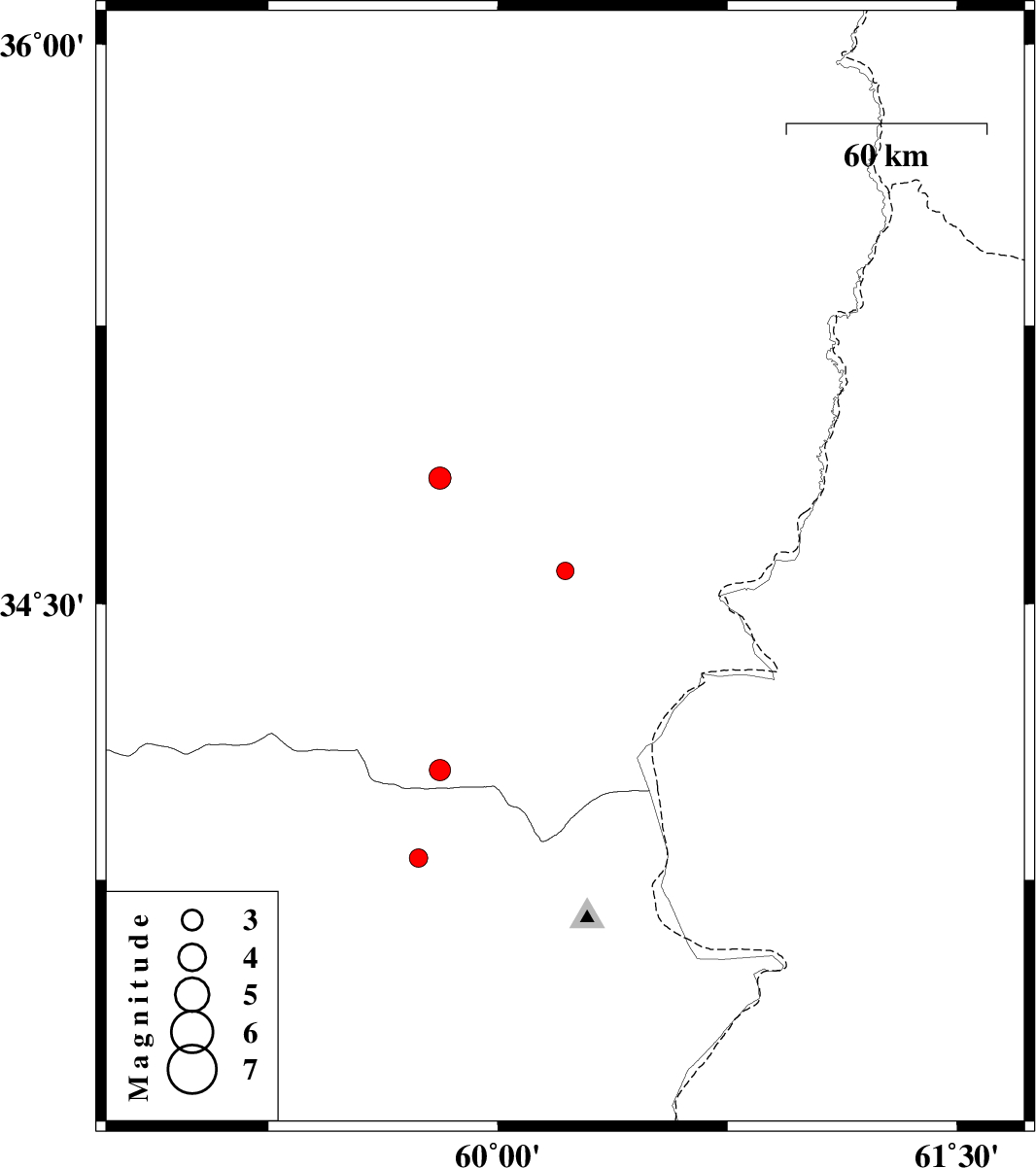 | 2015/05/15 | 13:02:21.5 | 17:32:21.5 | 34.05 | 59.81 | 18 | ML:3.1 | Khorasan(center) Province, 66 km South-West of Khaf |