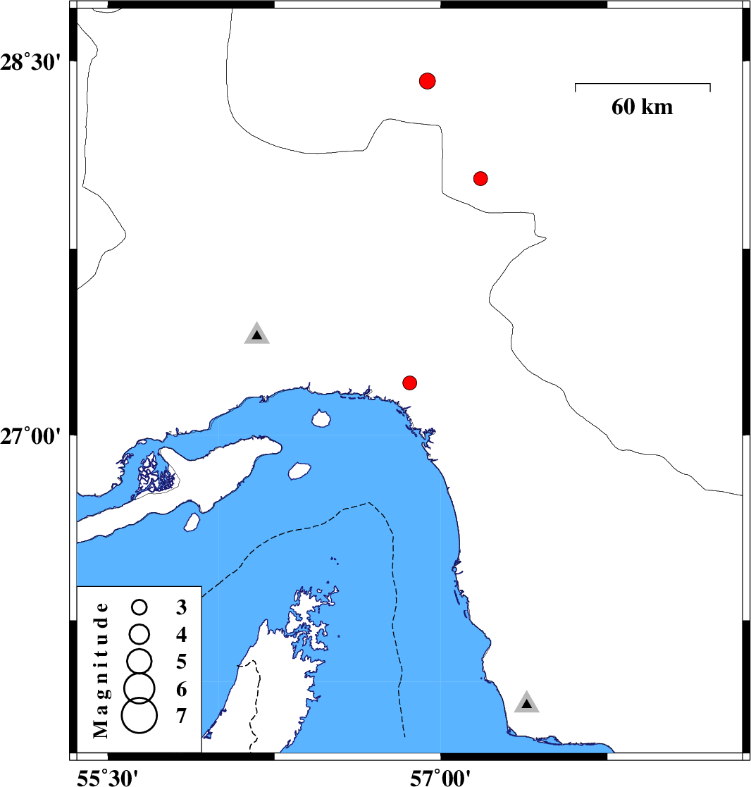 | 2015/06/15 | 12:11:25.7 | 16:41:25.7 | 27.21 | 56.86 | 18 | ML:2.8 | Hormozgan Province, 22 km West of Minab | ||