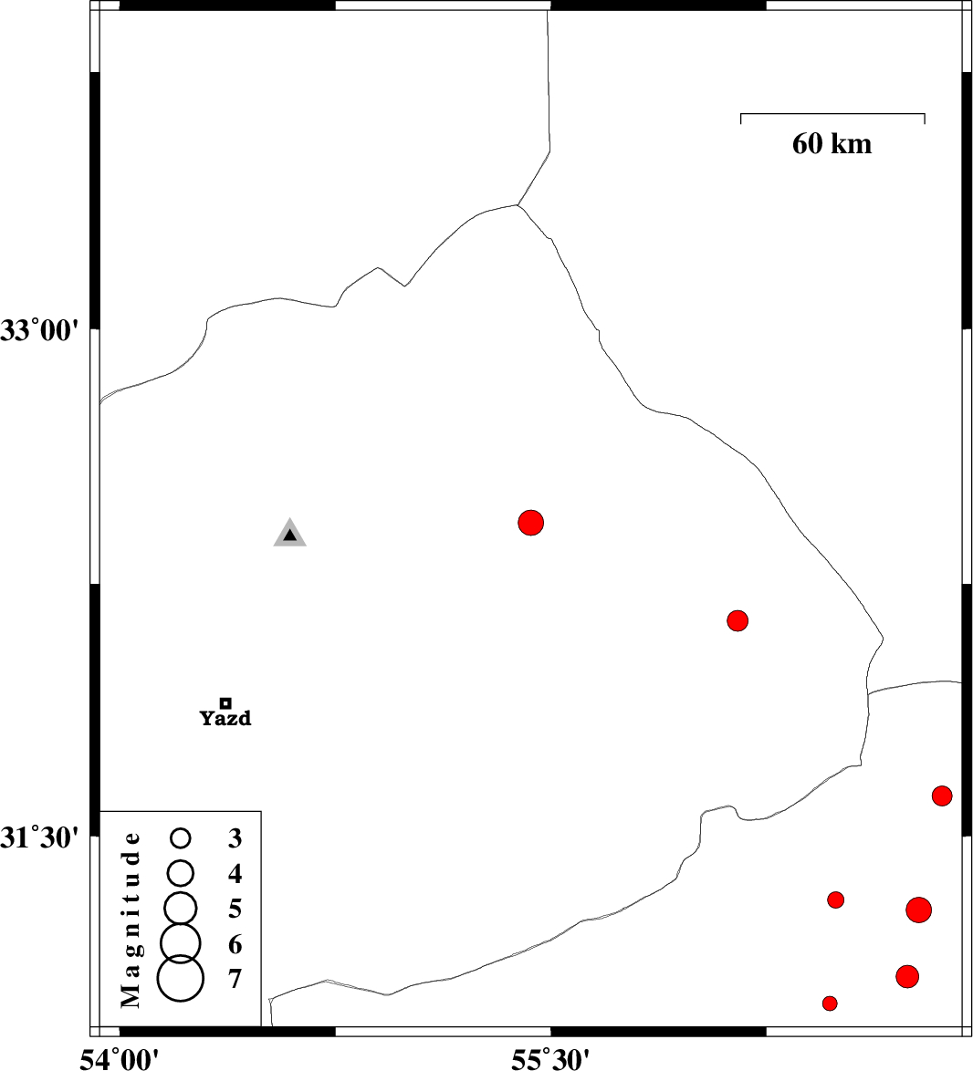| 2015/06/09 | 09:54:17.1 | 14:24:17.1 | 32.14 | 56.15 | 14 | ML:3.2 | Yazd Province, 93 km North-East of Bafq | ||
