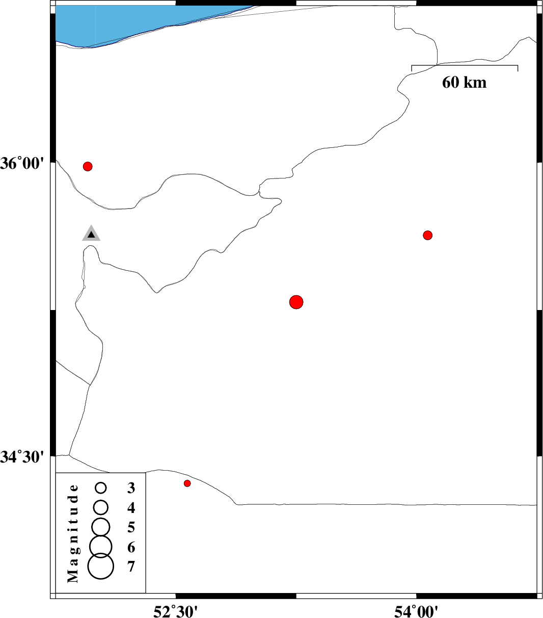 | 2015/06/25 | 07:16:31.6 | 11:46:31.6 | 35.29 | 53.25 | 18 | ML:3.8 | Semnan Province, 34 km South-West of Semnan | ||