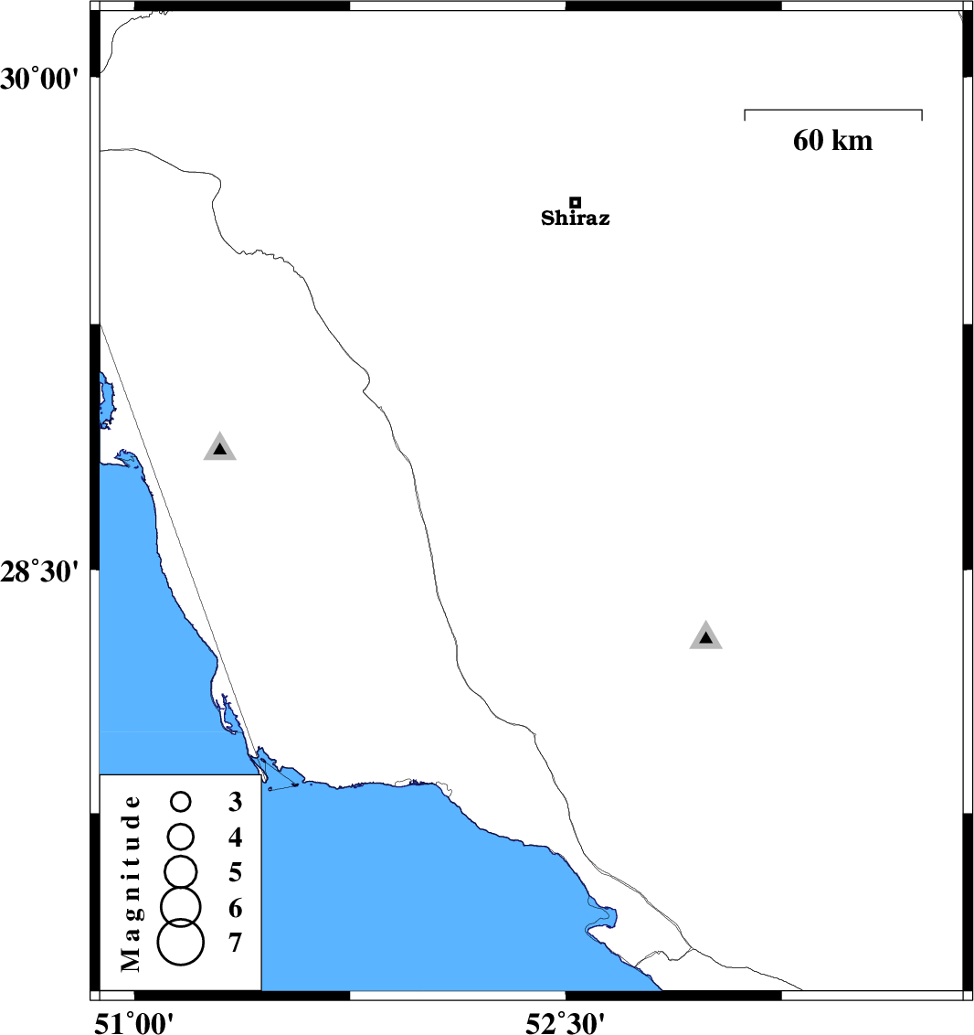| 2015/06/26 | 05:16:04.2 | 09:46:04.2 | 28.7 | 52.38 | 6 | ML:3.9 | Fars Province, 25 km South-West of Firuz Abad |