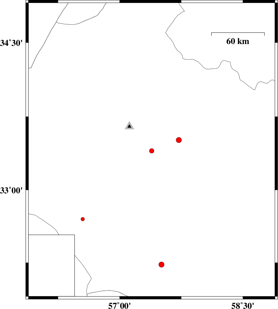 | 2015/06/29 | 22:04:29.6 | 02:34:29.6 | 33.4 | 57.39 | 19 | ML:2.6 | Yazd Province, 48 km South-East of Tabas | ||