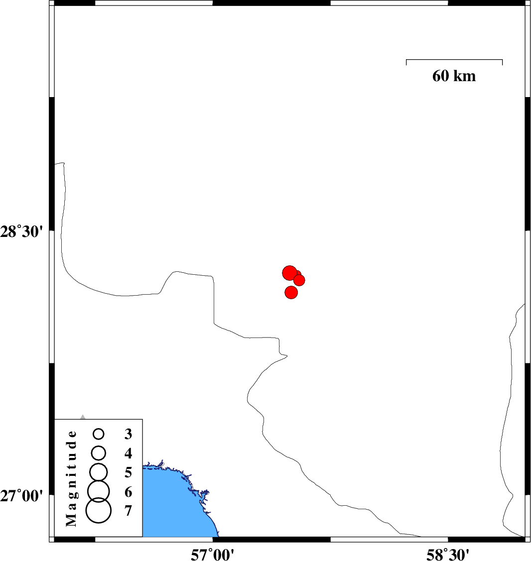 | 2015/07/01 | 06:45:56.4 | 11:15:56.4 | 28.15 | 57.5 | 46 | ML:3.7 | Kerman Province, 29 km North-West of Kahnuj | ||