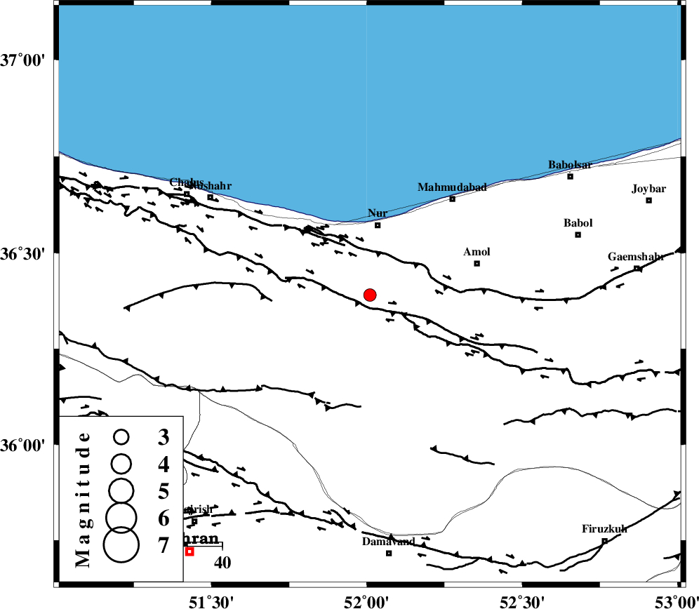 N_ALBORZ_F (Length: 360 km) , Distance to epicenter: 7 km | |